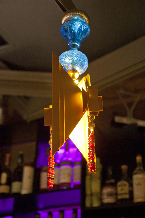 Each lamp is suspended on an architectural, geometric maze feature that runs above the bar.